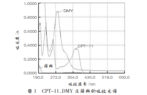 用 甲 醇 配 制 CPT-11、 DMY 和輔料(空白脂質體)等溶液,使用紫外分光 光度計在 190~600nm 處進行波長掃描,掃描結果見圖1。