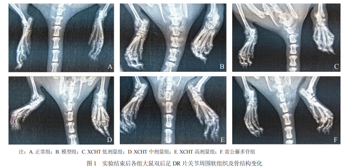 由圖 1 可見,正常組:大鼠雙踝關節周圍軟組織 無腫脹,無骨質疏松、骨質破壞。模型組:大鼠雙踝 關節周圍軟組織腫脹明顯,右踝較重,雙踝及跖趾關 節關節間隙不清,部分關節融合。XCHT 低劑量組: 大鼠雙踝關節周圍軟組織腫脹明顯,右踝較重,雙踝 及跖趾關節關節間隙不清,部分關節融合。XCHT 中劑量組:大鼠雙踝關節周圍軟組織腫脹明顯,右踝較 重,雙踝及跖趾關節關節間隙不清,部分關節融合。 XCHT 高劑量組:大鼠雙踝關節周圍軟組織腫脹明顯, 右踝較重;右踝及跖趾關節關節間隙不清,部分關節 融合,但較中劑量組及低劑量組程度輕;左踝及跖趾 關節關節間隙尚清,關節無融合。雷公藤多苷組:大鼠雙踝關節周圍軟組織腫脹明顯,右踝較重;右踝及 跖趾關節關節間隙不清,部分關節融合,但較中劑量 組及低劑量組程度輕,與高劑量組相似;左踝及跖趾 關節關節間隙尚清,關節無融合。