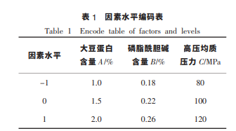 乳化制備工藝響應面優化 以大豆蛋白-磷脂酰 膽堿納米乳液的平均粒徑、PDI 及乳化產率為考 察指標,通過單因素試驗考察大豆蛋白含量、磷脂 酰膽堿含量、 高壓均質壓力及均質次數對 3 個指 標的影響規律。 進一步利用 Design-Expert 軟件對 試驗進行響應面分析設計優化試驗結果, 選取大 豆蛋白含量 A(%)、磷脂酰膽堿含量 B(%)、高壓 均質壓力 C(MPa)及均質次數 D(次)4 個因素為 自變量, 以粒徑 R1 (nm)、PDI R2 及乳化產率 R3 (%)為響應值,設置三因素三水平進行試驗,如表 1 所示。