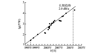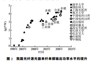 1993年,HongPo等人研制出摻釹雙包層光纖 激光 器。2002 年,J.Limpert 等 人 研 制 出 鉺 鐿 (Er3+/Yb3+ )共摻的雙包層光纖激光器,實現了150 W 的單模連續激光功率輸出,大大推動了高功率摻 鐿光纖激光器的開發。2009年,光纖激光器的全球 領跑者IPG 公司基于同帶泵浦技術使用1.018μm 的激 光 作 為 泵 浦 光,首 次 實 現 了 單 纖 單 模 輸 出 10 kW,光束 質 量 因 子 M2 <1.31。2012年,IPG 公 司的單纖單模功率達到了20kW。截至2019年 1月,IPG 公司 的 光 纖 激 光 器 最 高 輸 出 水 平 為 單 模 20kW 與多模500kW。圖1示出了國外光纖激光 器單纖單模激光功率P 的提升情況,可以看出從 1997年至2012年,光 纖激光器的單纖單模輸出功 率水平的提升大致為2.0dB/a,約合1.58倍/a。