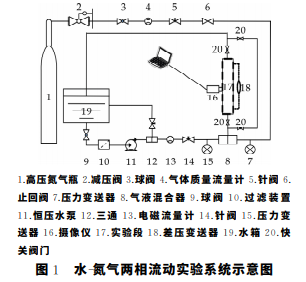 為滿足實驗條件,作者設計并搭建了如圖1所 示的兩相流實驗臺.實驗系統由循環水回路、氣路、 實驗段以及測量系統等組成.從高壓氮氣瓶流出的 氮氣依次經過減壓閥、高精度針閥、氣體質量流量 計、截止閥和混合器( 旋渦混合器VORTEX-5,海門市其林貝爾提供),水箱內的水依次流經過濾器、 變頻恒壓水泵、電 磁 流 量 計 和 混 合 器.混 合 后 的 氮 氣-水兩相流體流經實驗段,實驗段流出的水和氮 氣分別排入水箱和空氣.
