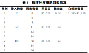NCI-H1975 細胞培養至融合度約為80%后用胰酶進行消化,加 入 CelltrackerCMFDA 染色工作液,于細胞正常生 長條件下孵 育30 min。換用新鮮培養基繼續培養 30min,將細胞 用 PBS漂洗 后,在熒光顯微鏡下使 用單細胞挑取系統挑取準確數量的細胞,按 照 5CTC/3 ml、25CTC/3 ml、50CTC/3 ml摻 入 全 血 中,每組設3個組內平行。 分別按照CTC定量檢測試劑盒及ClearCell○R FX1 循環腫瘤細胞活性分離系統說明書進行 CTC分離操 作,得到的細胞懸液置于96孔板中,在熒光顯微鏡下 進行觀察計數。按以下公式進行回收率計算:CTC回 收率=觀測CTC數量/摻入CTC總數×100%。
