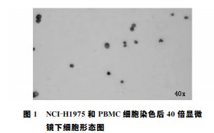 為確定經免疫化學染色鑒定后的腫瘤細胞形態 特征,我們先 對 NCI-H1975肺癌 細 胞 系、正 常 人 外 周血單核細胞 PBMC進行了染色鑒定,染色后腫瘤 細胞呈現典型的紅色,PBMC 染色后呈現典型的藍 黑色,形態特征見下圖1。