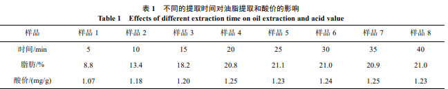 當樣品浸泡在正己烷溶劑中時, 溶解平衡使樣品中 的脂肪含量隨著時間的遞增呈現不同的濃度。因此研究不 同時間段溶劑對樣品脂肪的提取量和樣品脂肪酸價的影響, 對節(jié)省實驗時間具有重大意義。本次實驗分為 8 組, 每組 分別稱取 10 g 樣品于離心管中, 在管中分別加入過量的正 己烷(30 mL)進行震蕩溶解提取, 在 10~45 min 內每隔 5 min 測一次酸價和脂肪。最后對測定結果進行統(tǒng)計分析, 見表 1。 由表 1 可知, 隨著浸泡時間的增加, 溶劑中的脂肪含 量增加速率呈現不同變化, 經過分析可以將其變化速率分 為 3 個不同的階段。第 1 階段稱之為快速增長期, 在最初 提取的 15 min 內由于濃度梯度差很大, 樣品中的脂肪快速 溶解在正己烷溶劑中。第 2 階段為平緩增長期, 在提取的 15~25 min里, 樣品中的脂肪含量已經減少, 濃度梯度差變 小, 脂肪含量雖然也增加, 但增加的速度并沒有最初 1 階 段的速度快。第 3 階段為穩(wěn)定期, 在 25~40 min 的時間段, 脂肪含量并沒有增加, 提取含量達到最大值, 提取效果達 到最大化。酸值的變化與脂肪含量的變化呈現平行增長, 因此提取時間達到 25 min 以上時, 酸值趨于穩(wěn)定, 樣品中 不再有新油脂溶解出來, 脂肪的酸價一直保持穩(wěn)定狀態(tài)。 因此樣品經過正己烷溶劑浸泡 25 min 后就可以提取完畢, 同比國標方法的常溫靜置浸提(12 h)縮短 96%的時間, 同 比國標方法的索氏提取法(4 h)縮短 89%的時間, 是一種 高效快速的提取方法。