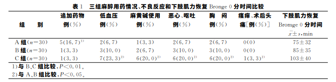 產(chǎn)婦入室后行血氧飽和度(SpO2)、心率(HR)、 呼吸(R)、心 電 圖(ECG)常 規(guī) 監(jiān) 測(cè)。麻 醉 前 給 予 復(fù) 方乳酸林格氏液8~10mL/kg,三組產(chǎn)婦均在左側(cè) 臥位下 于 L2~3或 L3~4間隙行針內(nèi)針腰麻穿刺術(shù)。 配制等比重腰麻藥物方法:取0.75%布比卡因2mL加腦脊液至3mL,A 組注射1.2mL(0.5%布比卡 因6mg),B 組 注 射 1.5 mL(0.5% 布 比 卡 因 7.5 mg),C組注射1.8mL(0.5%布比卡因9mg),推注 時(shí)間均為10s,給藥后留置硬膜外導(dǎo)管備用,平臥后 向左側(cè)搖床傾斜15°,常規(guī)預(yù)防仰臥位綜合征。采 用針刺法測(cè)試產(chǎn)婦疼痛消失的阻滯平面,痛 覺 消 失 達(dá) T8 以上開 始 手 術(shù);5min內(nèi) 未 達(dá) 到 此 平 面 時(shí),用 1.5%鹽酸利多 卡 因 以3mL 為單位通過硬膜外導(dǎo) 管注入硬膜外腔,使平面達(dá)到 T8 以上。術(shù)中監(jiān)測(cè)如 發(fā)現(xiàn)產(chǎn)婦出現(xiàn)低血壓[SBP<90mmHg或者平均動(dòng) 脈 壓 (MAP)低 于 基 礎(chǔ) 血 壓 的20% ](1mmHg= 0.133kPa),或伴有惡心嘔吐、胸悶不適主訴時(shí)給予 麻黃堿靜脈注射;產(chǎn)婦在術(shù)中有疼痛或手術(shù)者感覺 腹肌緊張影響手術(shù)為硬膜外追加藥物的特征,所 有 產(chǎn)婦術(shù)畢常規(guī)給予靜脈鎮(zhèn)痛泵止痛。