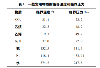 超臨界流體是指溫度處于其臨界溫度以上、且壓力處于 臨界壓力以上的流體。一些常用物質的臨界溫度和臨界壓 力如表 1 所示。