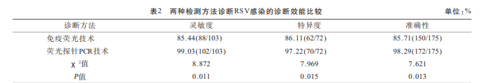 (表2) 免疫熒光技術(shù)檢測診斷患兒RSV感染的 靈 敏 度 、 特 異 度 以 及 準(zhǔn) 確 性 分 別 為 85.44% 、 86.11%、85.71%。熒光探針PCR技術(shù)檢測診斷的 靈 敏 度 、特 異 度 以 及 準(zhǔn) 確 性 分 別 為 99.03% 、 97.22%、98.29%,兩者相比熒光探針PCR技術(shù)檢 測診斷患兒RSV感染的各項診斷效能均優(yōu)于免 疫熒光技術(shù)檢測,差異有統(tǒng)計學(xué)意義(P<0.05)。